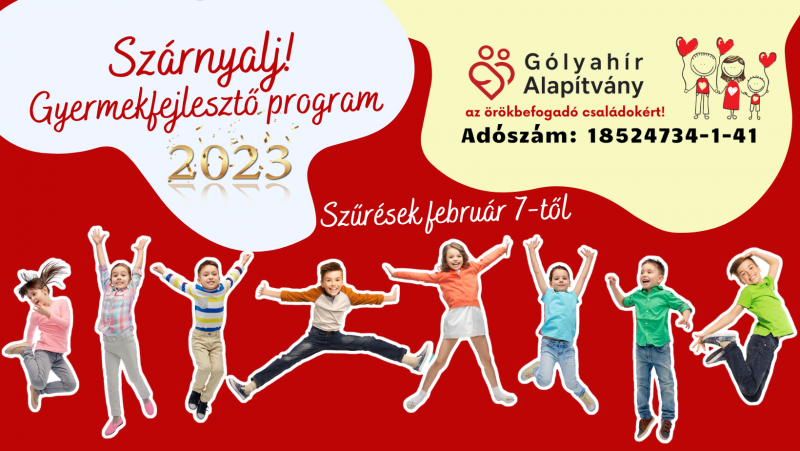 2023. év elején elindult SZÁRNYALJ! gyermekfejlesztési programunk, amelynek keretében 100 örökbefogadott gyermek korai szűrését végezzük el, hogy örökbefogadó szüleik teljes képet kapjanak a gondozatlan terhességekből, szerhasználatból eredő fejlődési elmaradásokról és orientációt kaphassanak a szükséges fejlesztésekkel kapcsolatban. Hisszük, hogy fontos és hiánypótló kezdeményezést nyújtunk az örökbefogadó családoknak, hiszen a szűrésekre a legszenzibilisebb korban kerül sor, amikor – célirányos fejlesztésekkel – még lehetőség van arra, hogy az érintett gyermekek iskoláskorra behozzák elmaradásaikat.