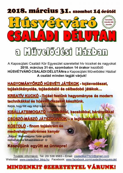 HÚSVÉTVÁRÓ CSALÁDI DÉLUTÁN (márc. 31.) - azért szervezzük, hogy az ünnephez kapcsolódó szokásokat és a régi népi játékokat megismertessük a mai gyerekekkel.
