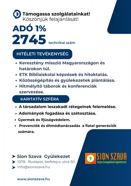 Köszönjük szépen, ha adója 1%-val támogatni tudja szolgálatunk hitéleti és karitatív területeinek gyümölcsözését! Isten áldását kívánjuk szeretettel!